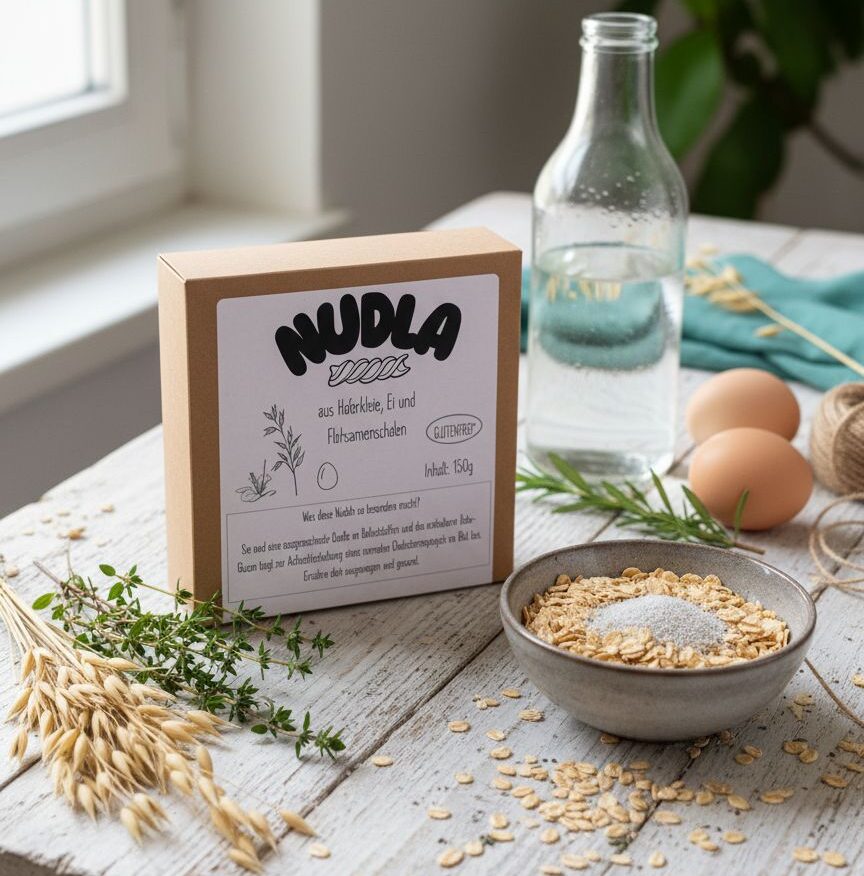 Bei der Etikettengestaltung fielen uns die vielen positiven Eigenschaften der Haferkleie auf. Nicht zu Unrecht wird sie auch als „Superfood“ bezeichnet. Haferkleie, Flohsamenschalen und Eier sind von Natur aus glutenfrei. Unsere Nudeln sind somit eine gute Alternative für Personen welche auf Gluten verzichten. Außerdem ist der hohe Ballaststoffgehalt ein weiteres Kriterium, welche die Nudeln zu einem Produkt machen, welche gerne verspeist werden.